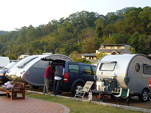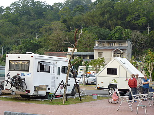 露營車的車主和朋友們開著玩笑說